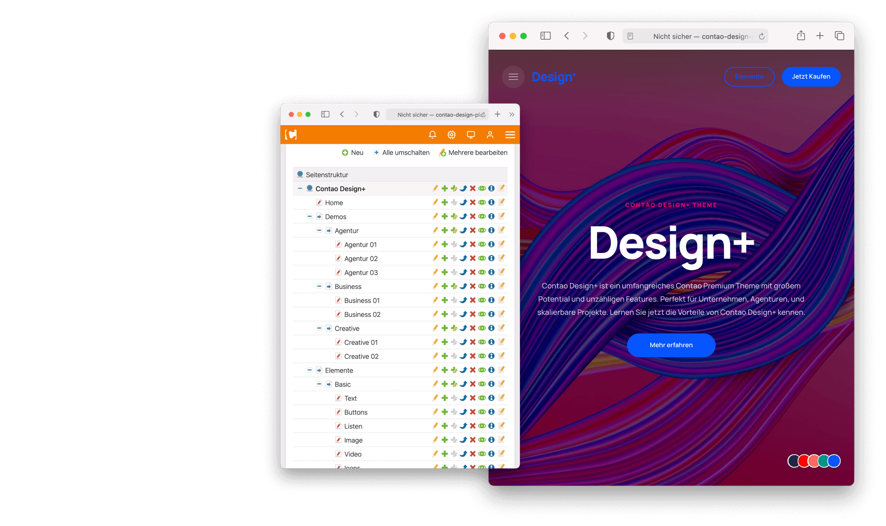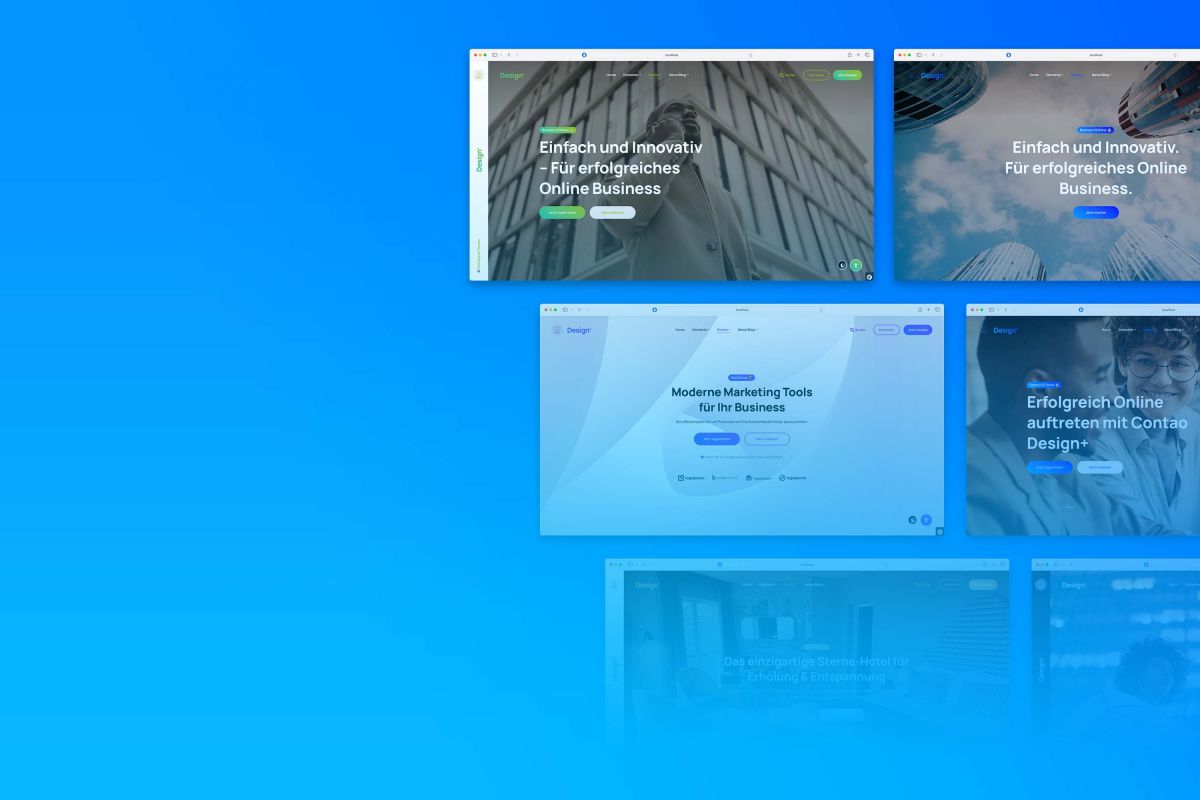 Mit Contao 4 oder Contao 5 als intuitiver Basis ermöglicht das Theme verschiedenste Anforderungen mit Leichtigkeit und ohne Programmierkenntnisse umzusetzen. Aus einem Set von über 100 aufeinander abgestimmten Elementen können innovative Onepager oder umfangreiche Business Websites im Handumdrehen erstellt werden. Hunderte Kunden haben Contao Design+ bereits erfolgreich im Einsatz. Nutzen auch Sie jetzt die Vorteile von Contao Design+.